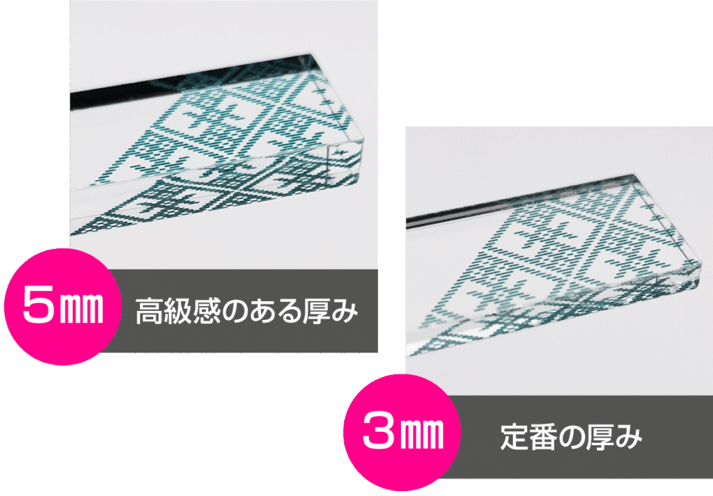 アクリルキーホルダー・アクリルスタンドなどのアクリルグッズでは定番の厚さの3mm、高級感が出る厚さの5mmをご用意。様々な製品に応じて厚さを選べます!