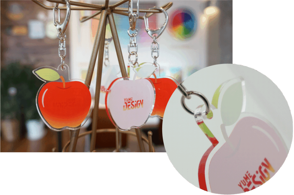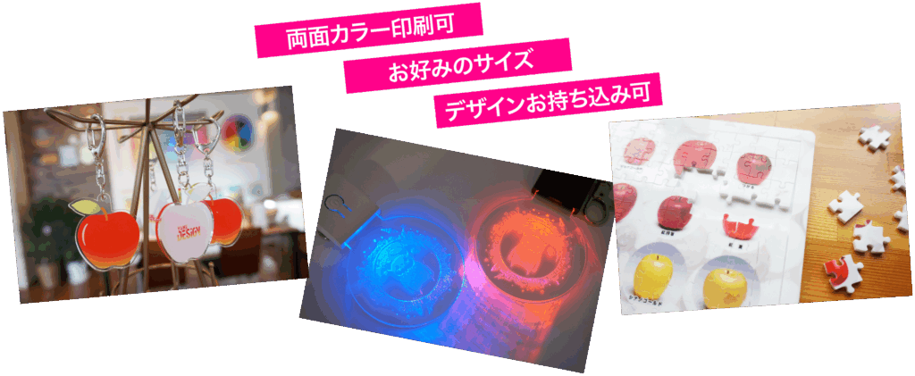サンプル製品各種は青森市中央のショールームにて展示中です。あなただけのオリジナルアクリルグッズ製作をサポートいたします、ぜひお手にとってご検討ください。