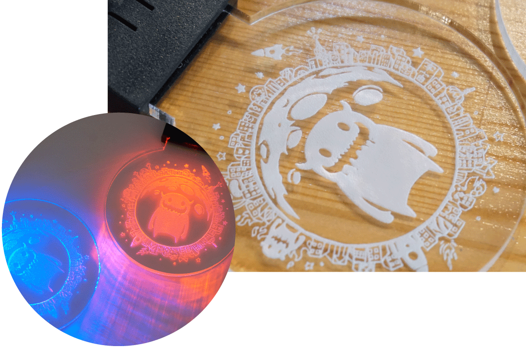 細かいイラストデータもレーザー加工が可能。透明アクリル✕レーザー彫刻はシンプルできれいめなデザインや光るパーツとの相性も◎