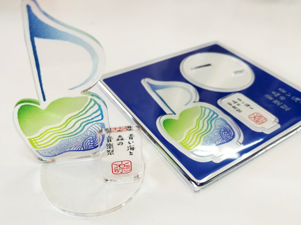 東奥日報社主催の青い海と森の音楽祭で販売されるオリジナルグッズとして、音楽祭のロゴを印刷したアクリルスタンドを制作させていただきました。グラデーションや細かいデザイン部分も、UV印刷できれいに表現できるので、透明アクリルに映える美しいアクリルスタンドとなりました。