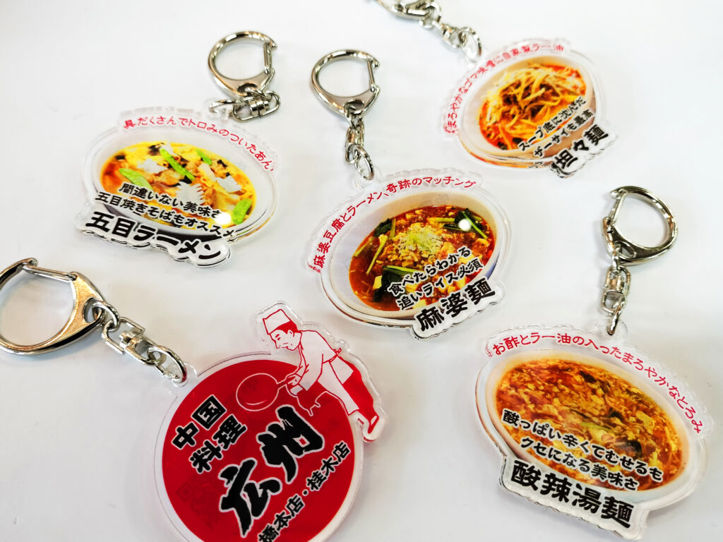 青森市にあります中華料理 広州さんのアクリルキーホルダーを制作しました。広州おじさんとラーメンの全部で5種類。キーホルダーのメニュー紹介は、広州ファンであるデザイナーが考えました。現在は橋本店と桂木店の2店舗で販売しています。