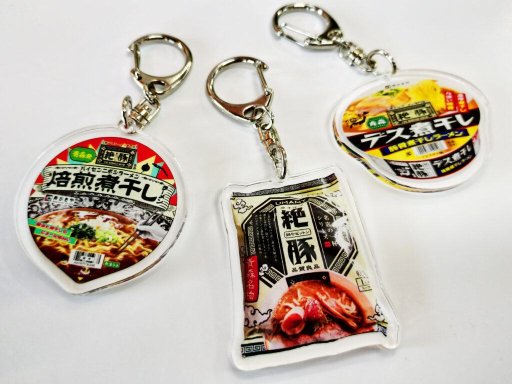 青森市にあります麺やゼットンさんのオリジナル商品のアクリルキーホルダーを制作させていただきました。デザイン性の高い商品パッケージがアクリルとの相性◎